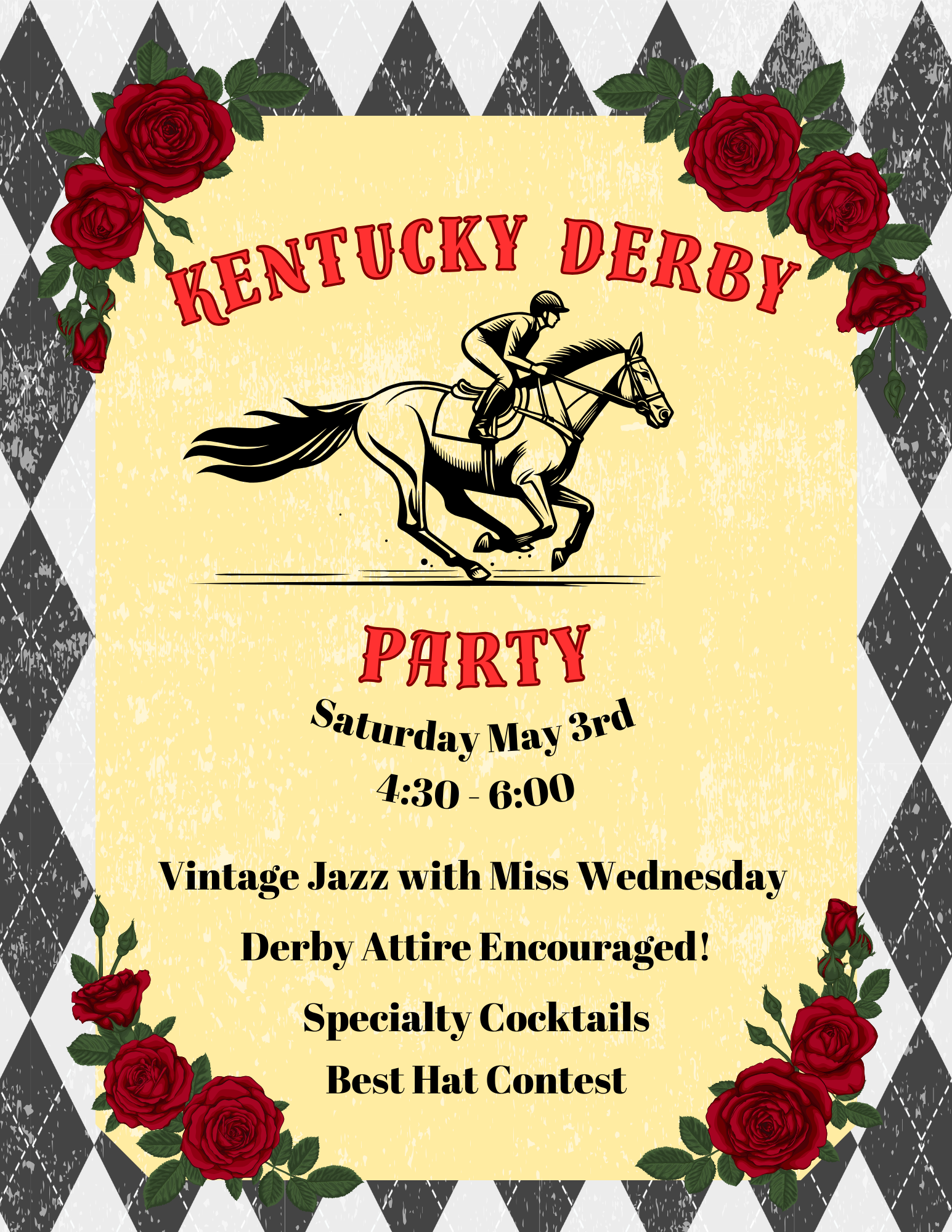 More Info: Cheer on the horses while listening to vintage jazz and sipping specialty cocktails. Derby attire is encouraged and there will be a best hat contest.