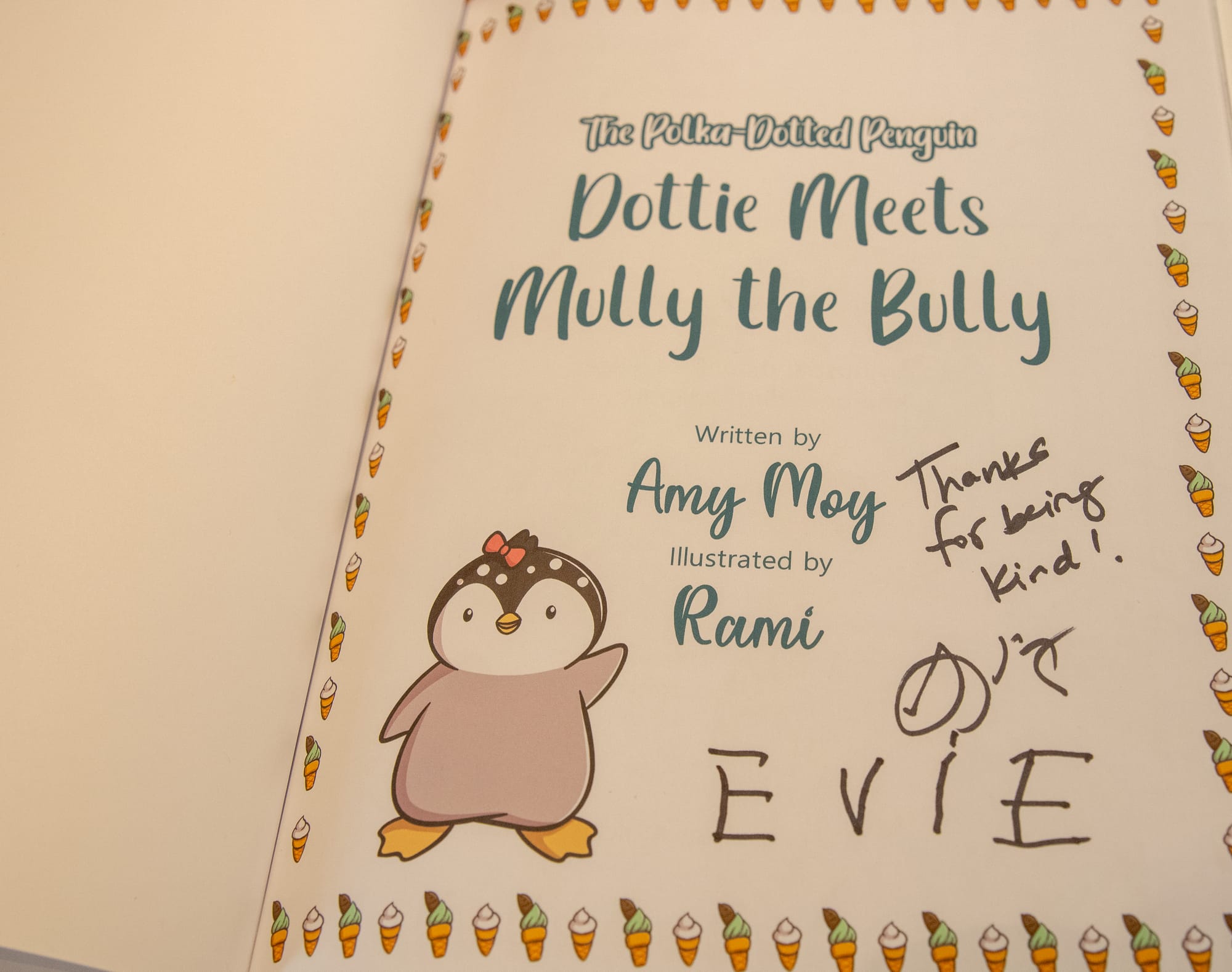 Moy said she went on fiverr.com and asked five artists to draw what they thought Dottie should look like. After seeing Indonesia-based illustrator Rami’s drawing of the penguin, Moy chose to use his illustrations for all three books.