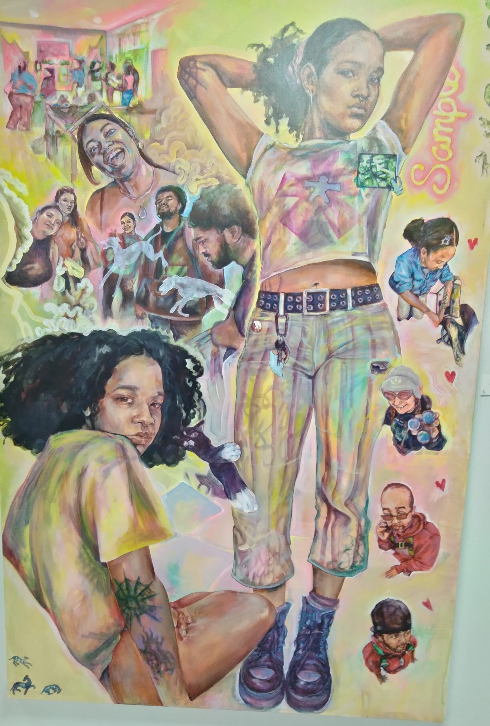 The building stands out in its section of Mystic Avenue. It is painted white but sports a colorful mural by Hilary Bouvier that sits above a wide glass entryway.