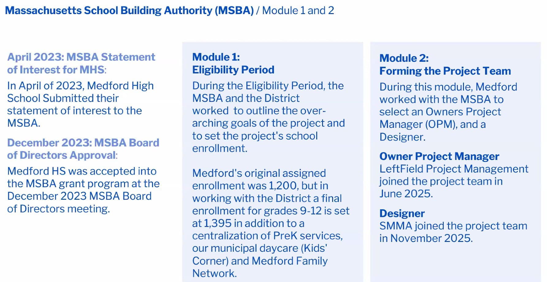 Medford has already moved through the MSBA’s first and second “modules,” where the state sees if the district meets its eligibility standards. During Module 1, the MSBA worked with the district on the “overarching goals of the project” and set the school enrollment.