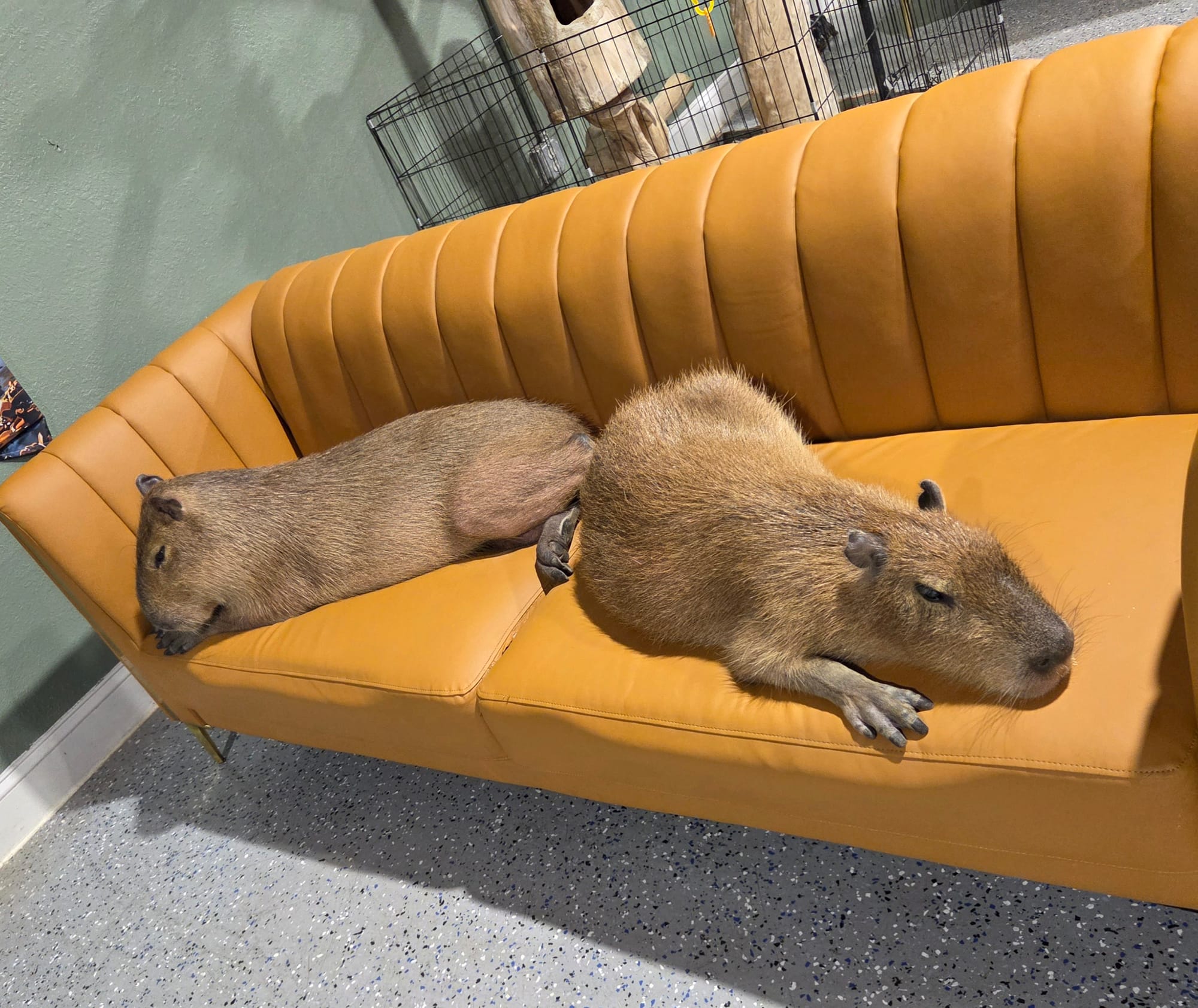 As we were leaving, we walked through the main lounge, where two capys commandeered an entire couch for themselves for napping, ferrets were trying to figure out how to get out of their enclosure, a tortoise walked slowly by two chairs occupied by small goats, and a little white and black rooster wandered around.