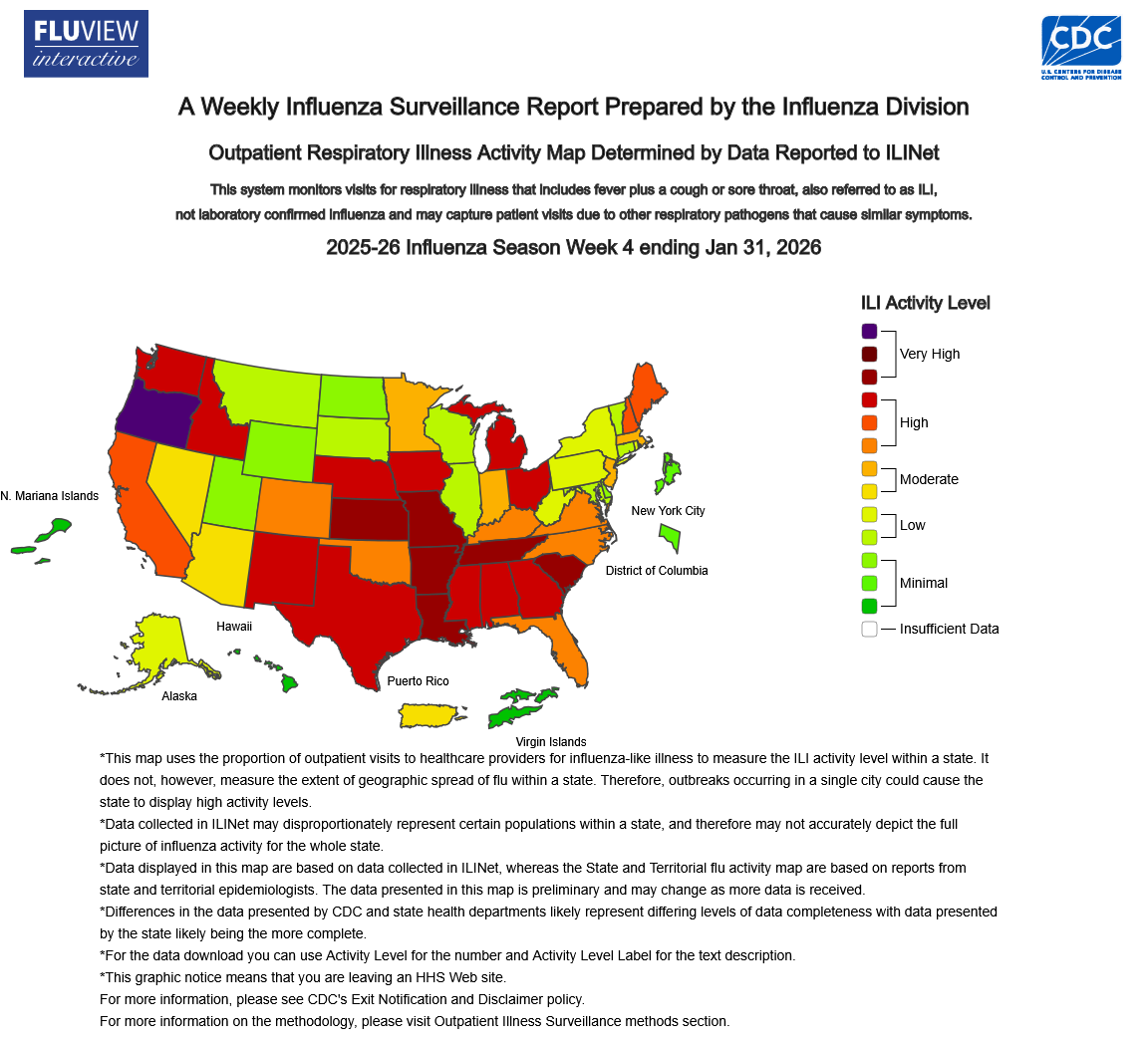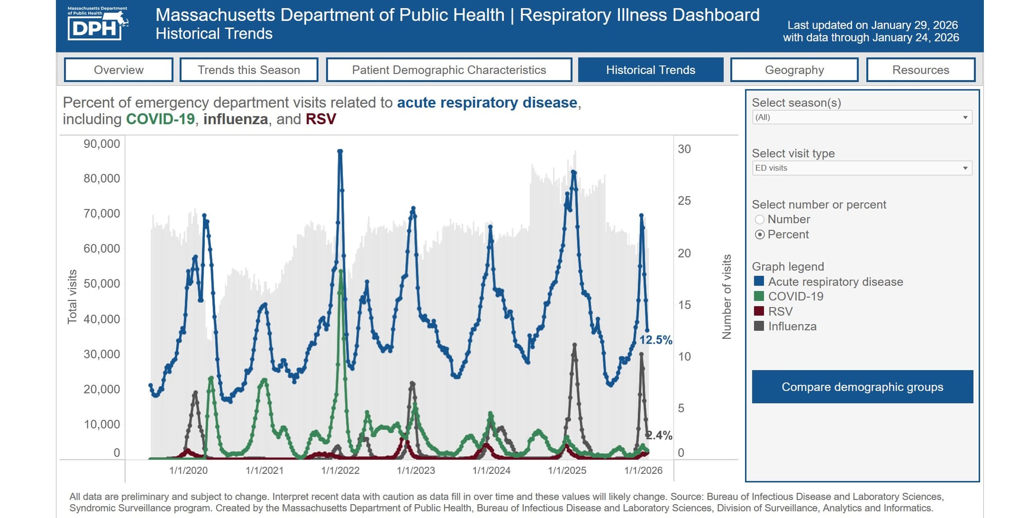 According to the Massachusetts Department of Public Health, the number of emergency room visits has dropped from the beginning of 2026 when they were at an all-time high. The latest numbers — from the week of Jan. 18 to Jan. 24 — saw an estimated 12.5% of visits focused on acute respiratory illness: 0.9% for COVID-19; 2.4% for influenza; and 0.7% for RSV.