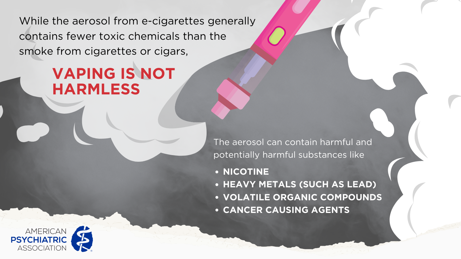 Vaping involves electronic or e-cigarettes, which mimic smoking and expel steam instead of smoke, but still contains nicotine, a highly addictive substance found in tobacco.