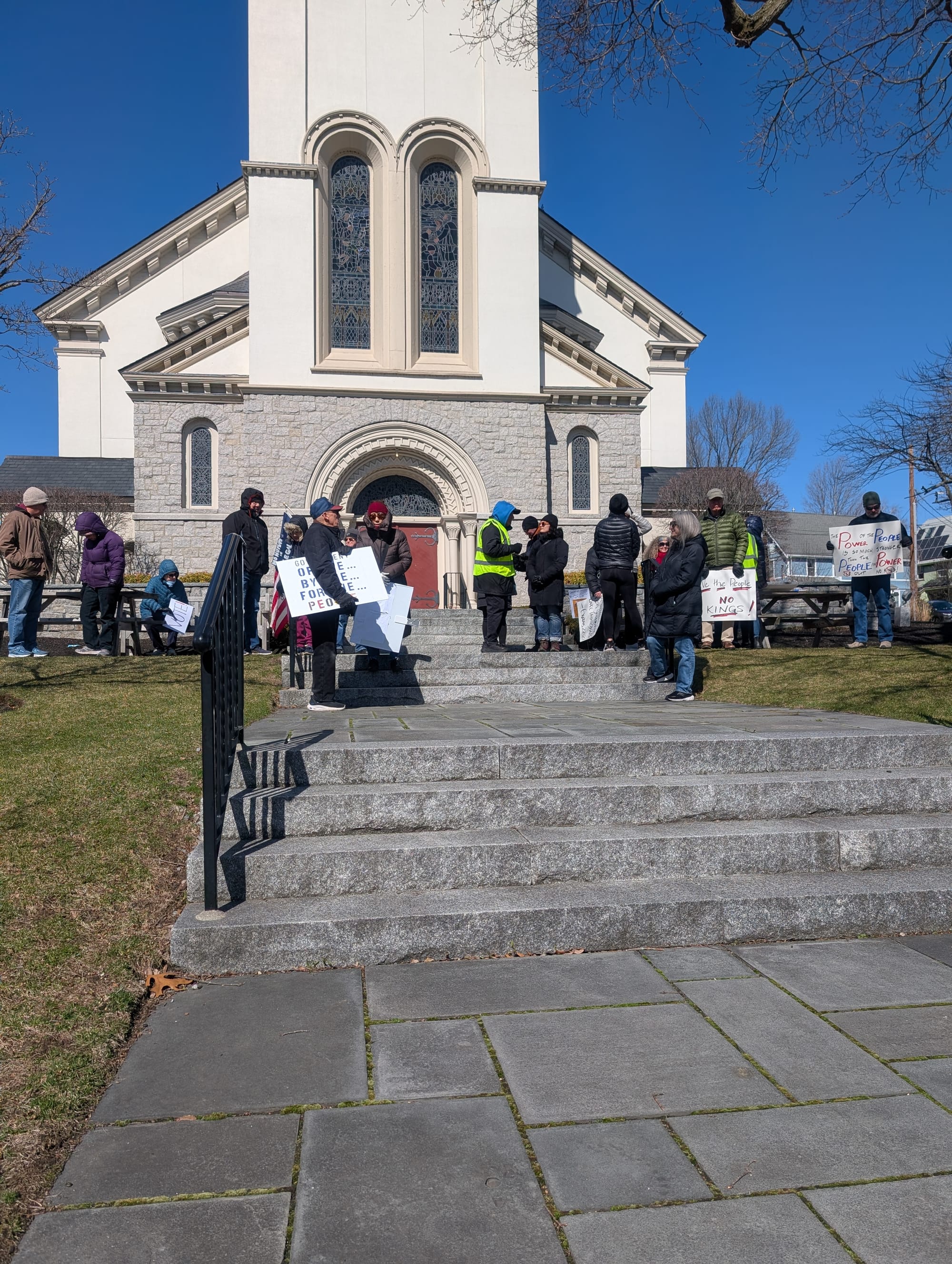 For about two hours, protesters spread across the Winchester Unitarian Society’s lawn and on the sidewalks across from the building and in the surrounding area.