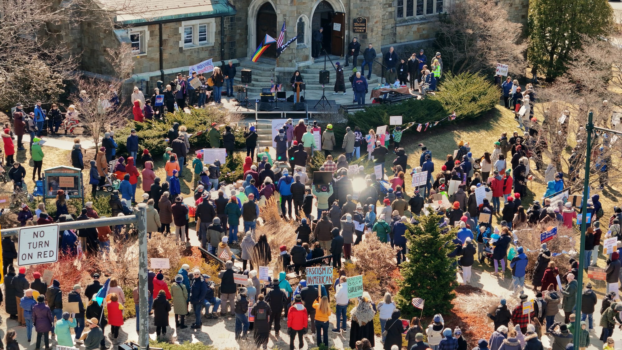 For about two hours, protesters spread across the Winchester Unitarian Society’s lawn and on the sidewalks across from the building and in the surrounding area.