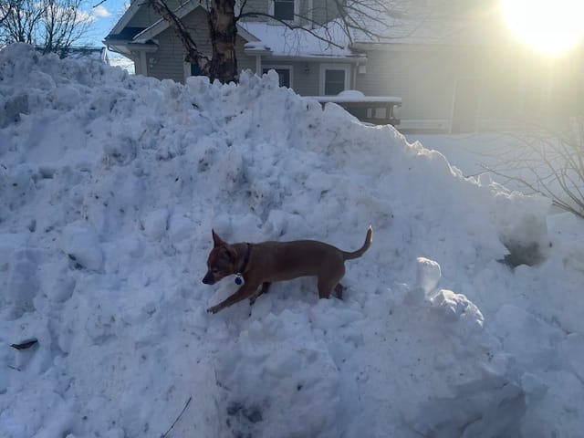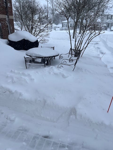 Matt Wilson submitted these photos that he took on Playstead Road. Latke was having fun exploring the snow banks, patio furniture was nearly buried, and at times the windows were covered with snow. Once the snow stopped flying, a beautiful blue sky contrasted with the white snow. COURTESY PHOTOS/Matt Wilson