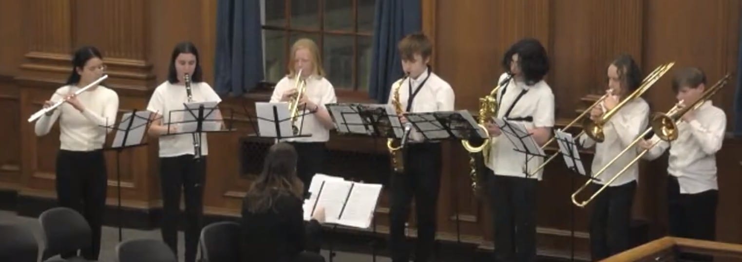 During a Mustang Moment at a recent School Committee meeting the Middle School Select Band performed. The band, directed by Emma Baptist, who started the band three years ago, played "Livin' on a Prayer" by Bon Jovi, "Twist & Shout" by the Beatles, and "Enter Sandman" by Metallica. Students then talked to the School Committee about their participation in the band program and how much they loved it.