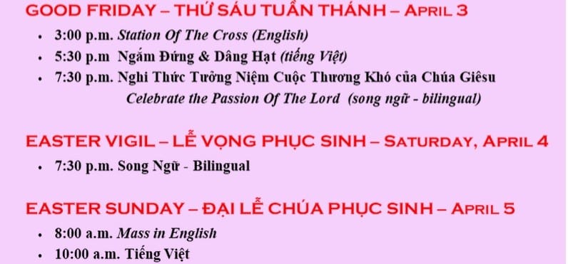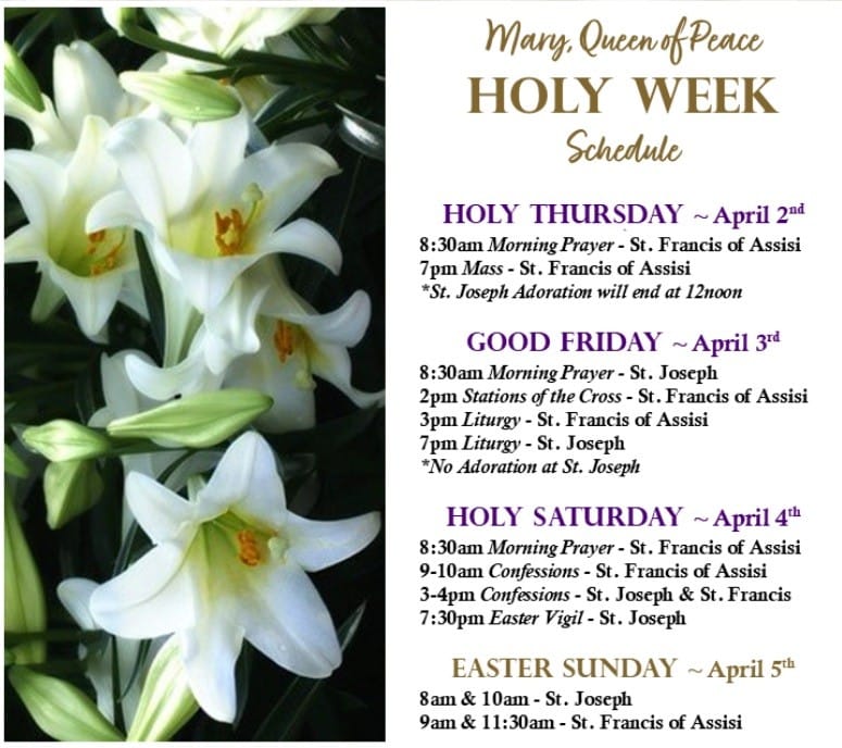 St. Raphael Parish Easter Services: Holy Saturday, April 4, Easter Vigil, at 7 p.m. Easter Sunday, April 5, four Masses - 7:30 a.m. Mass; 9 a.m. Mass with the Children's Choir; 10:30 a.m. Mass with the One Voice Choir; 12 p.m. Mass.