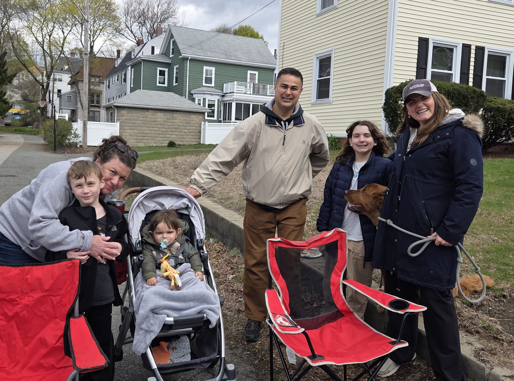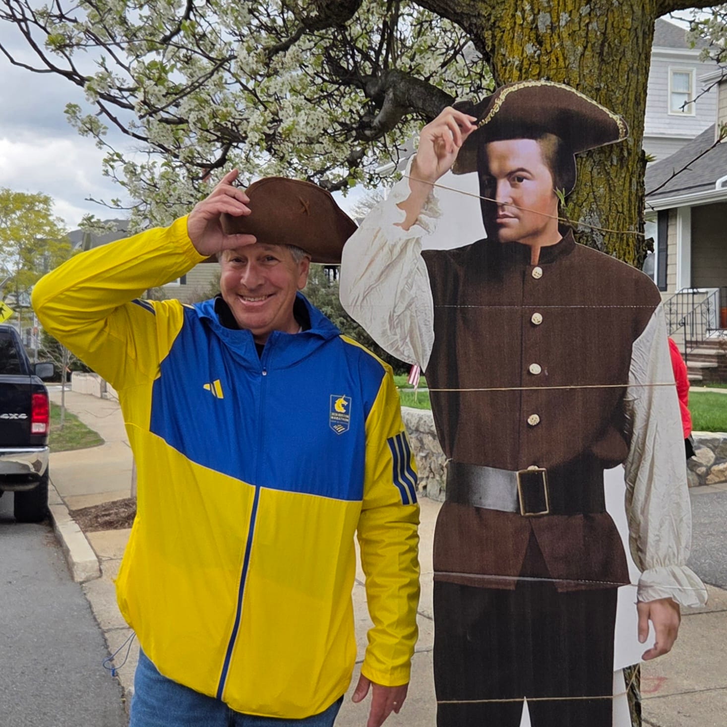 High Street resident Joe O'Leary was out on the sidewalk in front of his house with friends and family members. O'Leary, who posed for photos with a cutout of Paul Revere, said it has become an annual event to greet Revere as he rides by and try to get him to make an unofficial stop.