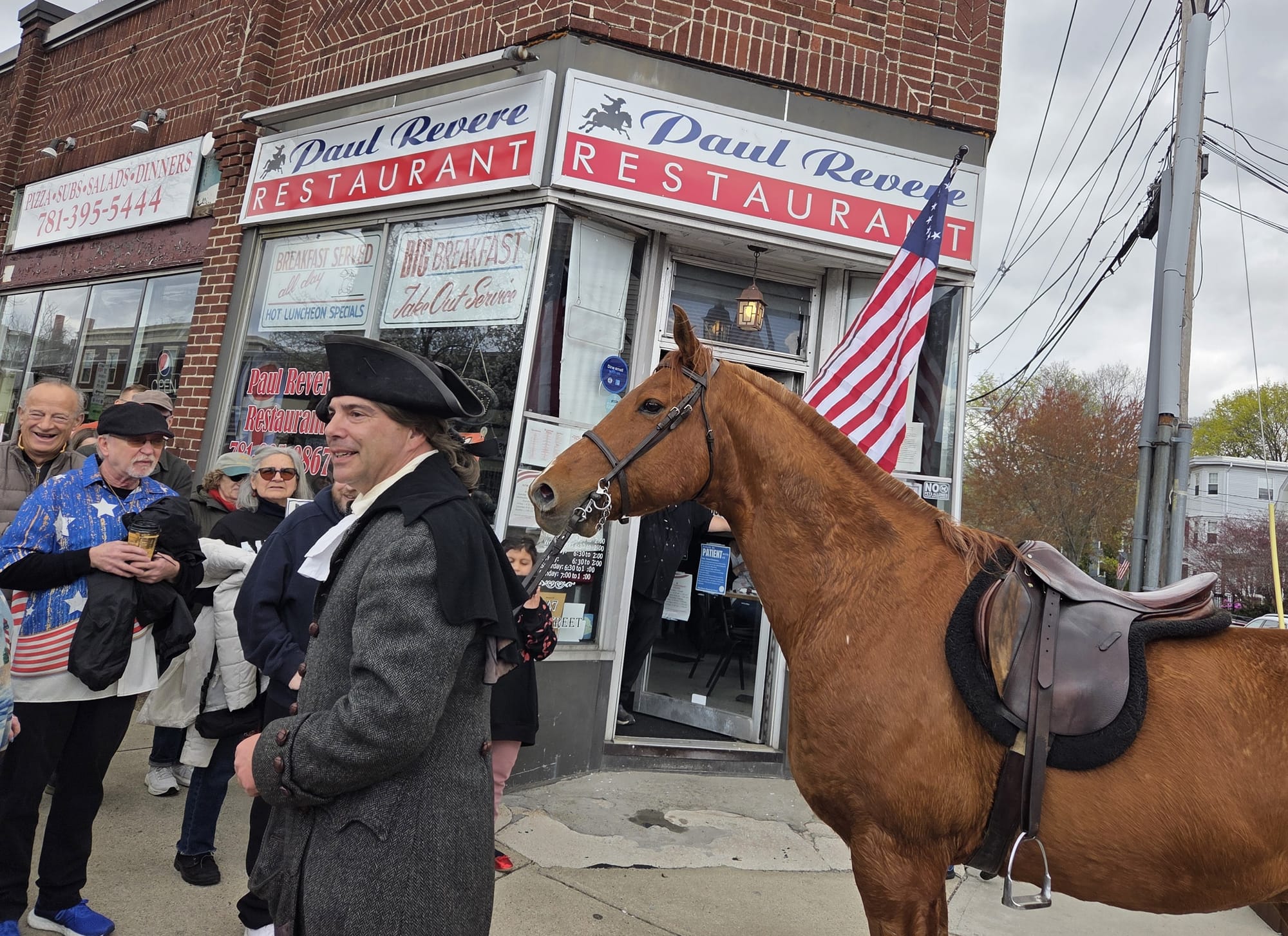 A crowd gathered in front of the Paul Revere Restaurant with cameras and cell phones at the ready. Owner Joe Schanda, Sr., who was in the doorway of the restaurant as Revere addressed the group, said he was just getting ready to clean the grill when Revere arrived. He pointed out his son, Joe Schanda, Jr., with whom he runs the restaurant.