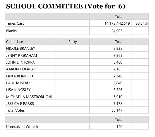 For School Committee, two incumbents lost their bids for reelection: Nicole Branley and John Intoppa. Newcomers Jessica Parks and Michael Mastrobuoni will join the committee.