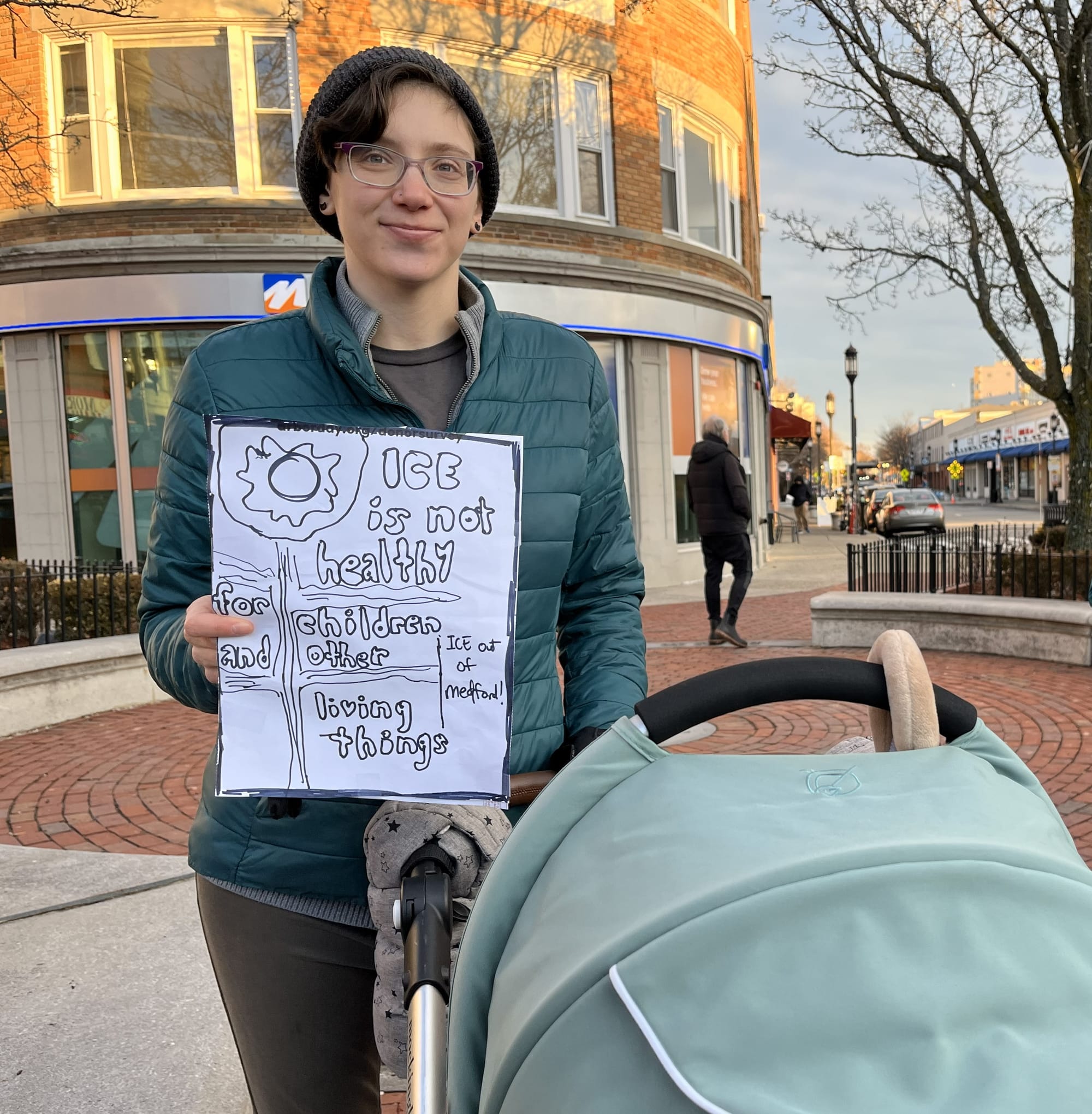 Theresa Racicot was there, she said, “Because it's important to take action and be in community with others. Standing out in Medford Square, for everyone walking, cycling, and driving by shows our fellow neighbors that if they are feeling scared or not sure what they can do to join in this fight against this regime, they can see people standing up for what is right, standing up to protect immigrants, and seeing that they are not alone, that other people feel the same as they do. Finding others helps the work of social justice move forward. We can't do this work alone, in community we find strength.”