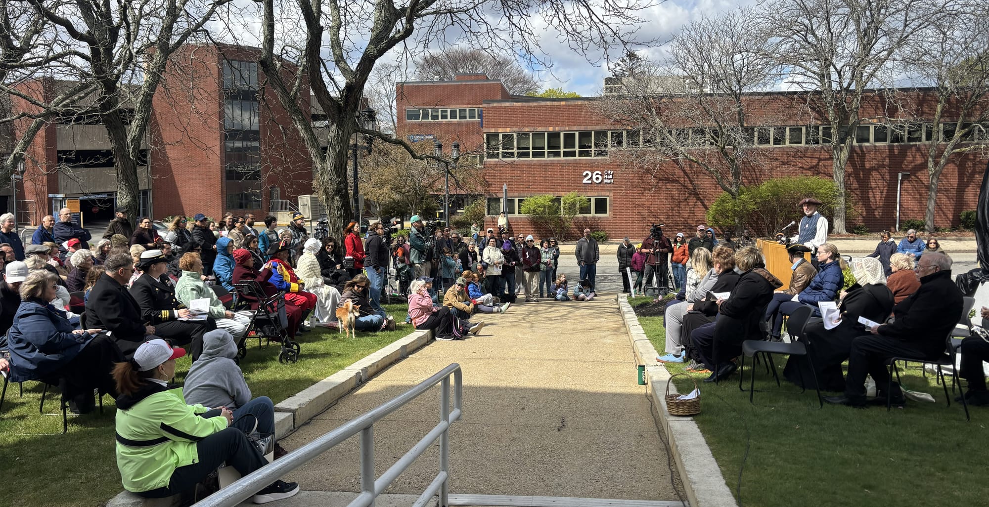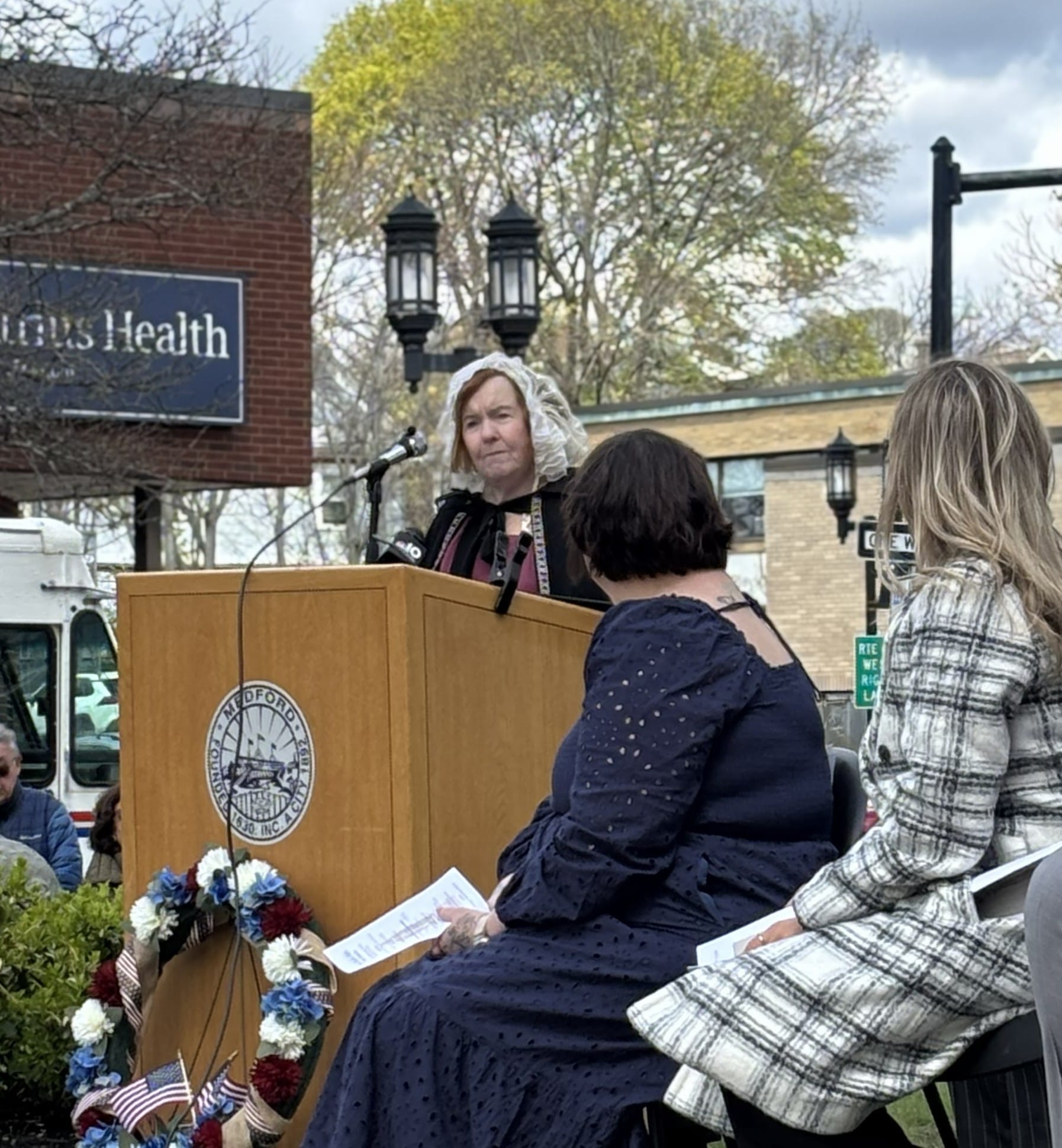City Council President Zac Bears gave welcoming remarks before inviting Mayor Lungo-Koehn up to the podium to speak about why the city celebrates Patriots' Day. Then, Laura Duggan of Looking Back at Medford History Inc. took the mic.