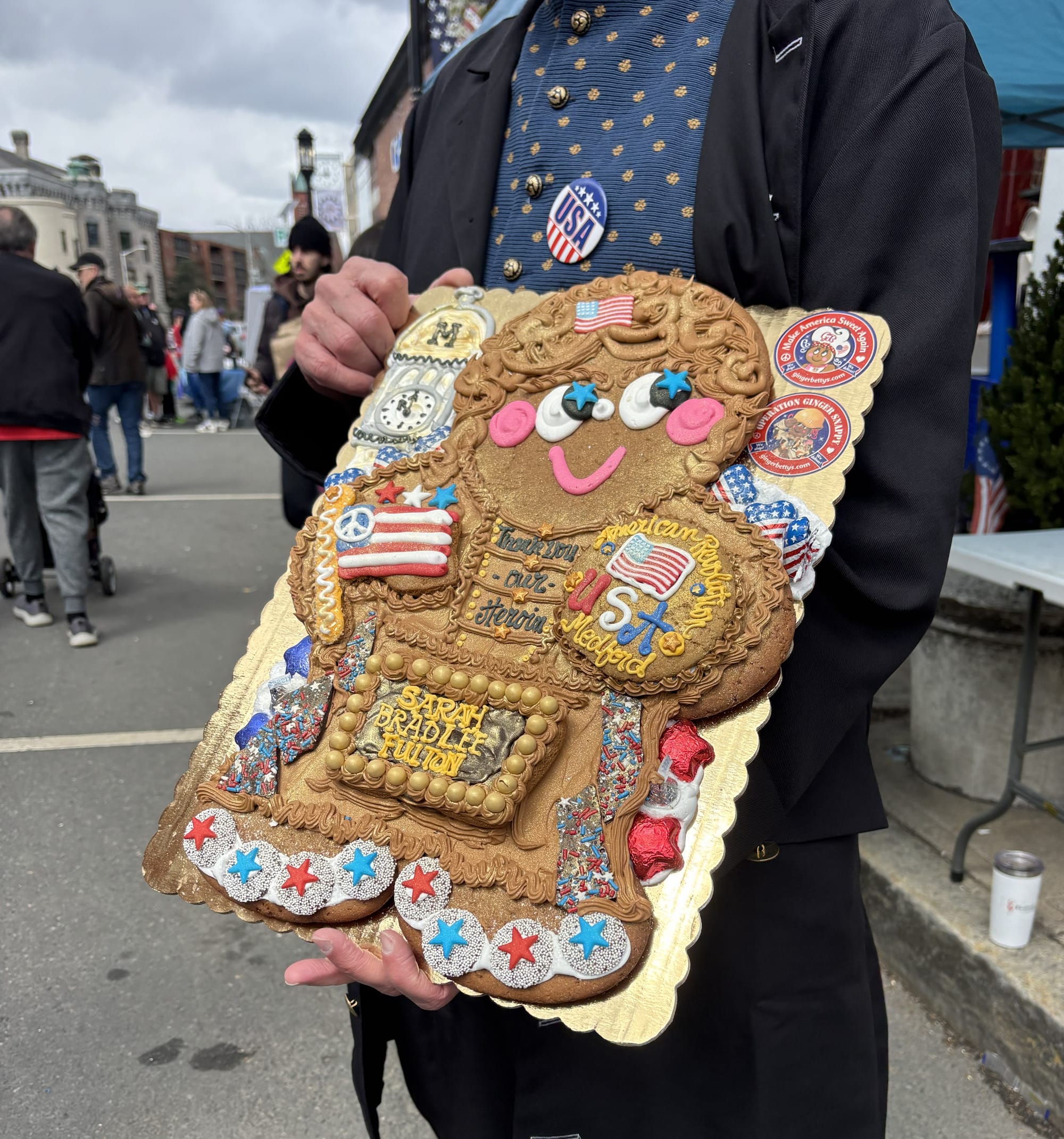 While Revere is an annual guest at Medford’s Patriots’ Day celebration, he had to share the spotlight this year with Sarah Bradlee Fulton, to whom a complimentary cake and a large gingerbread cookie were dedicated.