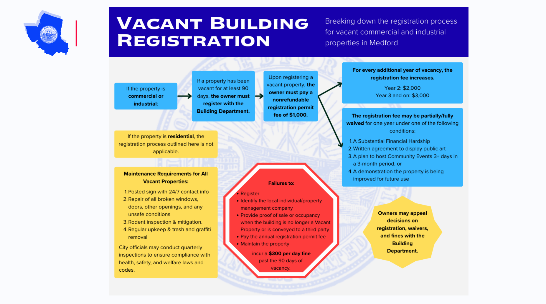 Vacant buildings, and Medford has had at least two that have been that way for some time, is an issue that city councilors hear about regularly, said Councilor Matt Leming.